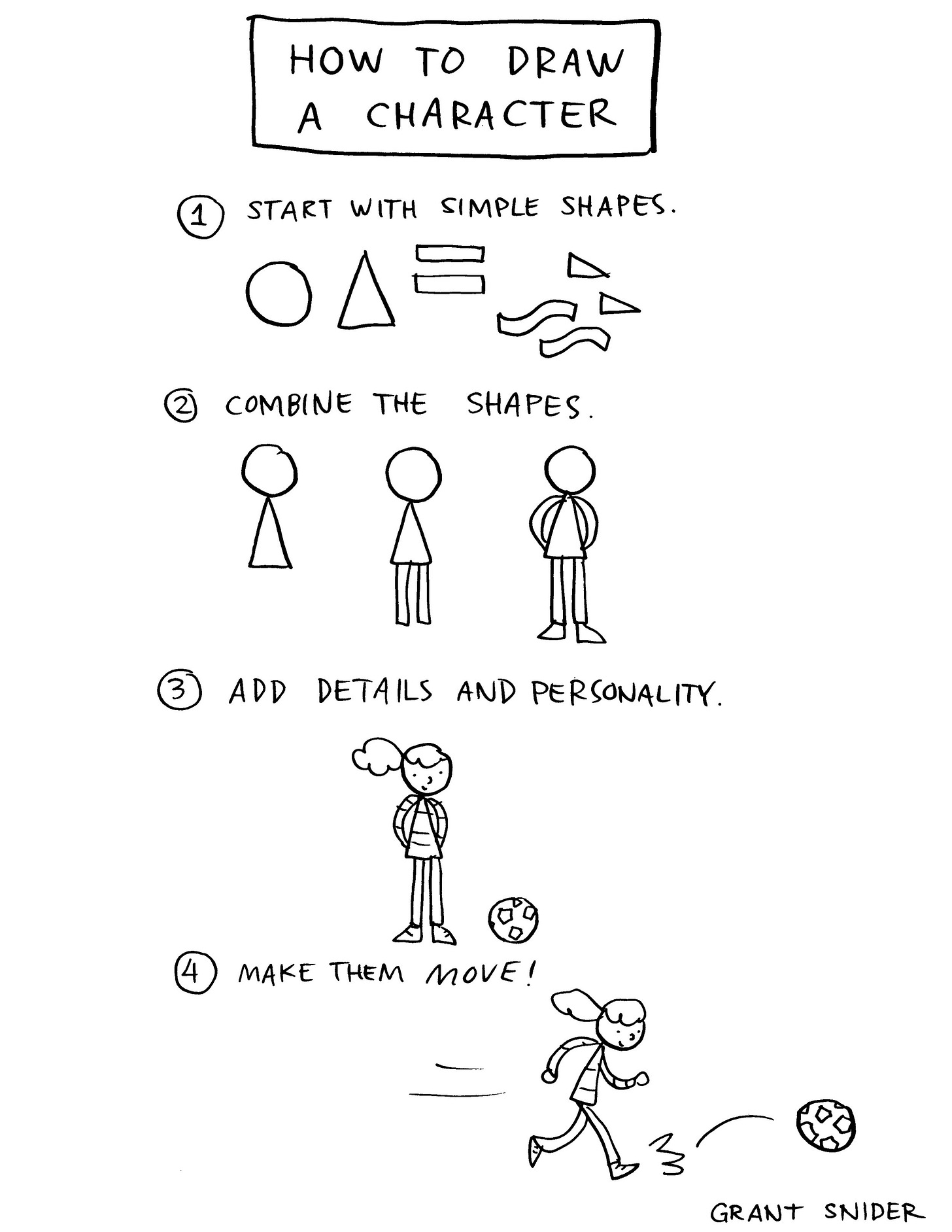 Make each character distinct in shape and personality. Let their form dictate their behavior and action. How do they complement or oppose the main character? What new direction can they take the story?
