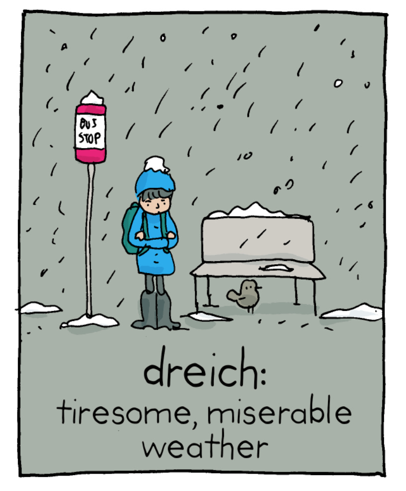 Dreich is a word used Scotland. In fact, it was named the most iconic Scots word by the Scottish Book Trust. Is the weather there really that dreary? I need to buy a plane ticket to find out. I’ll make sure to pack for a week of smurr.