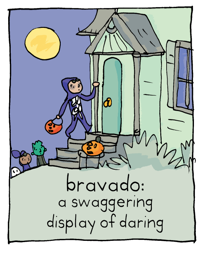 Bravado is forced bravery, exaggerated to conceal fear. Maybe every courageous action has an equal and opposite reaction: running the other way.