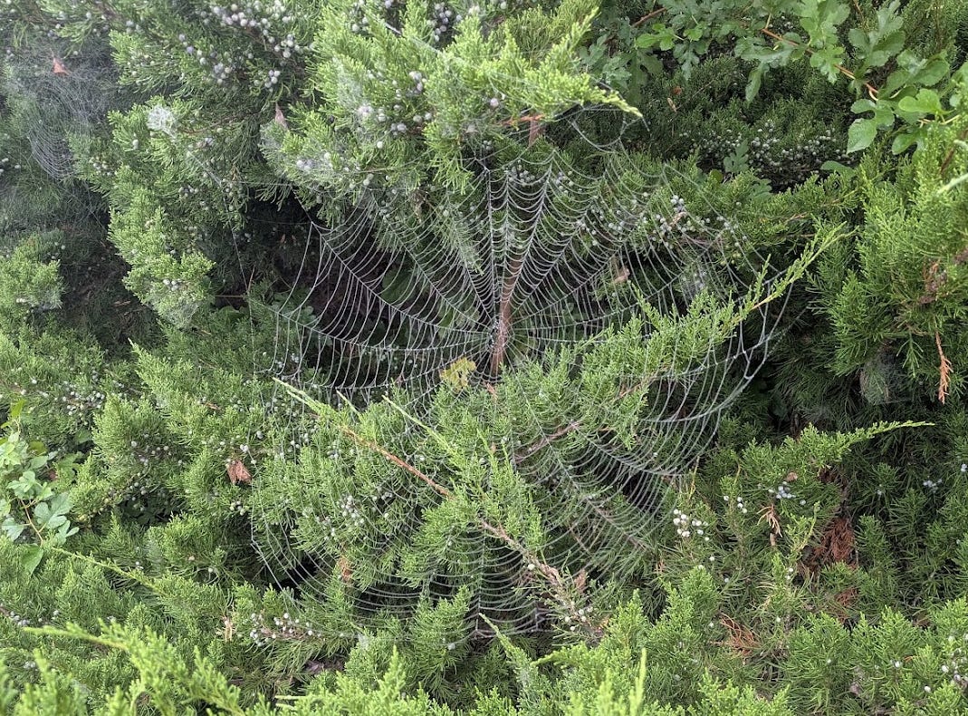 In morning fog, spiderwebs are revealed. Their lattice patterns hang heavy with liquid droplets, like necklaces of tiny jewels.