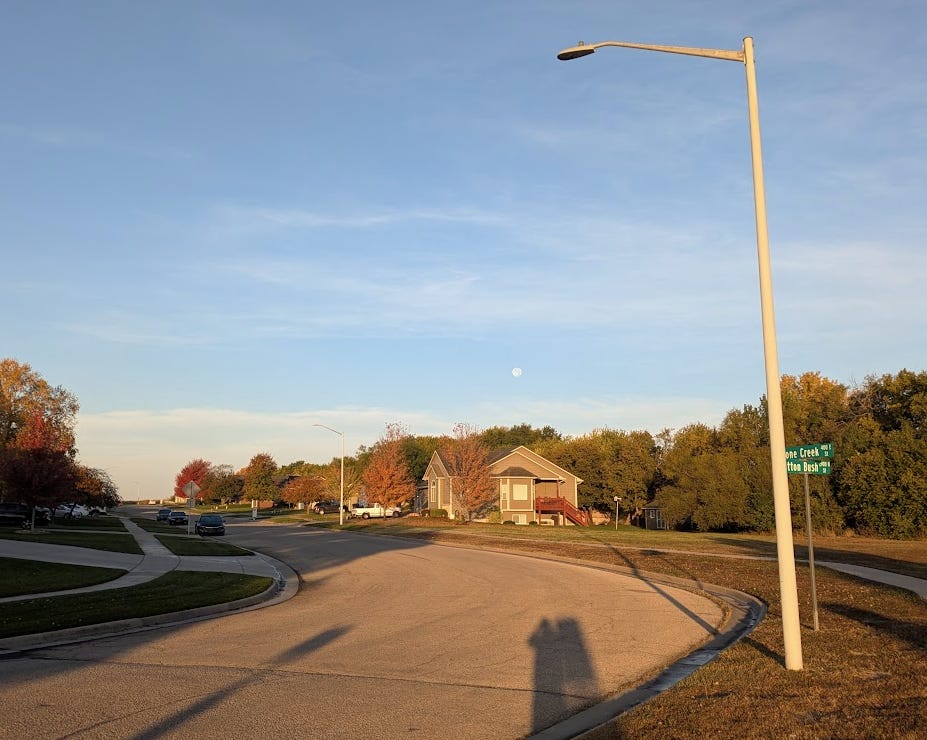 If you wake early in November, you’ll still find lawn sprinklers running at dawn. The air is chilly—finally. The autumn sky is a pastel gradient of color. And the moon has not yet gone to bed.